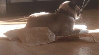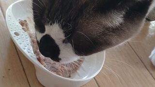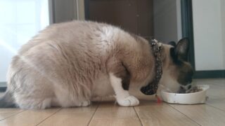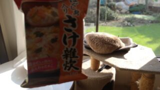 ぽて腹はみ出る猫を見ながら、さけ雑炊をいただきます。#アマノフーズさけ雑炊 #ぽて腹 #猫のいる暮らし