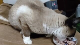 ぱっぱが甘やかしの極致に達し、ちゅーるをあげた後さらに焼きかつおを、あろう事か!あろう事か…!あったかマットの上で食べさせている!!#猫好きさんと繋がりたい