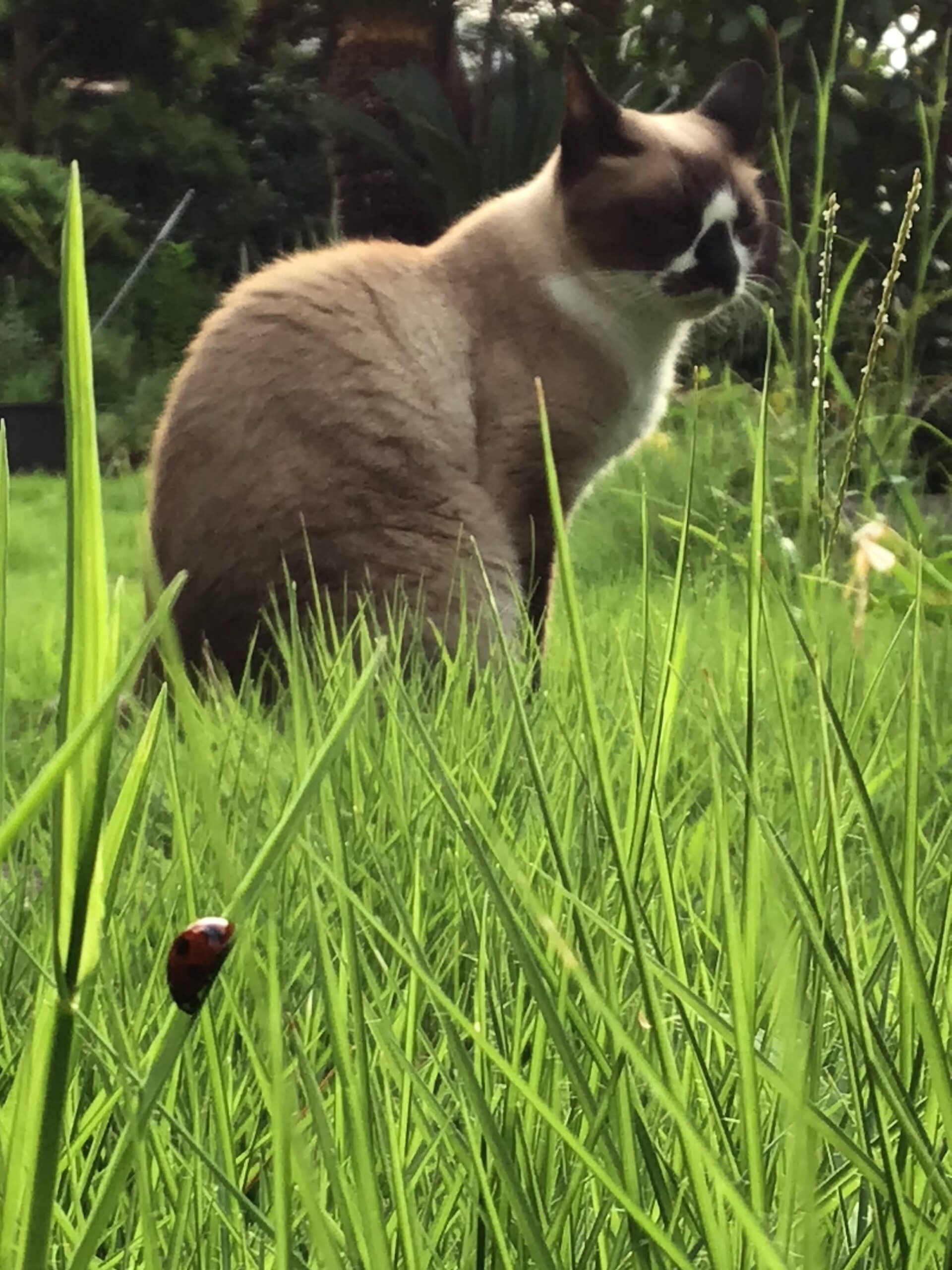 「朝日を浴びる猫」を撮ろうと思い庭へ出たら 七星てんとう虫を発見!