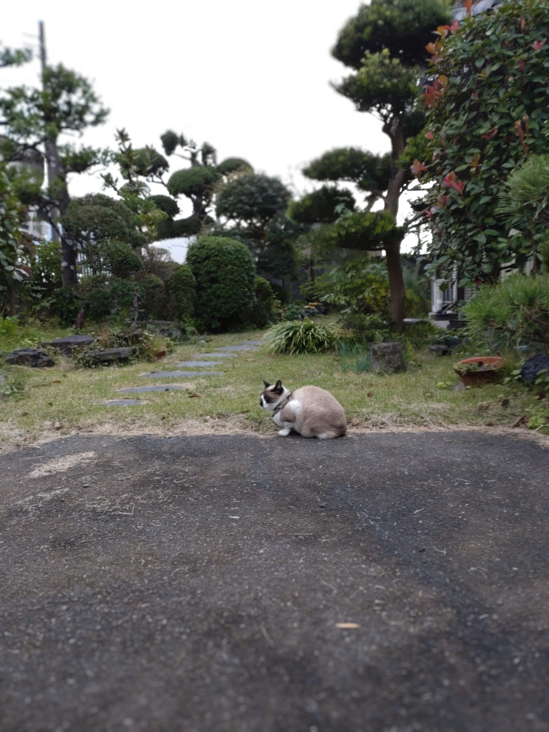 ぽつーんと縮んで困って丸くなってる猫。