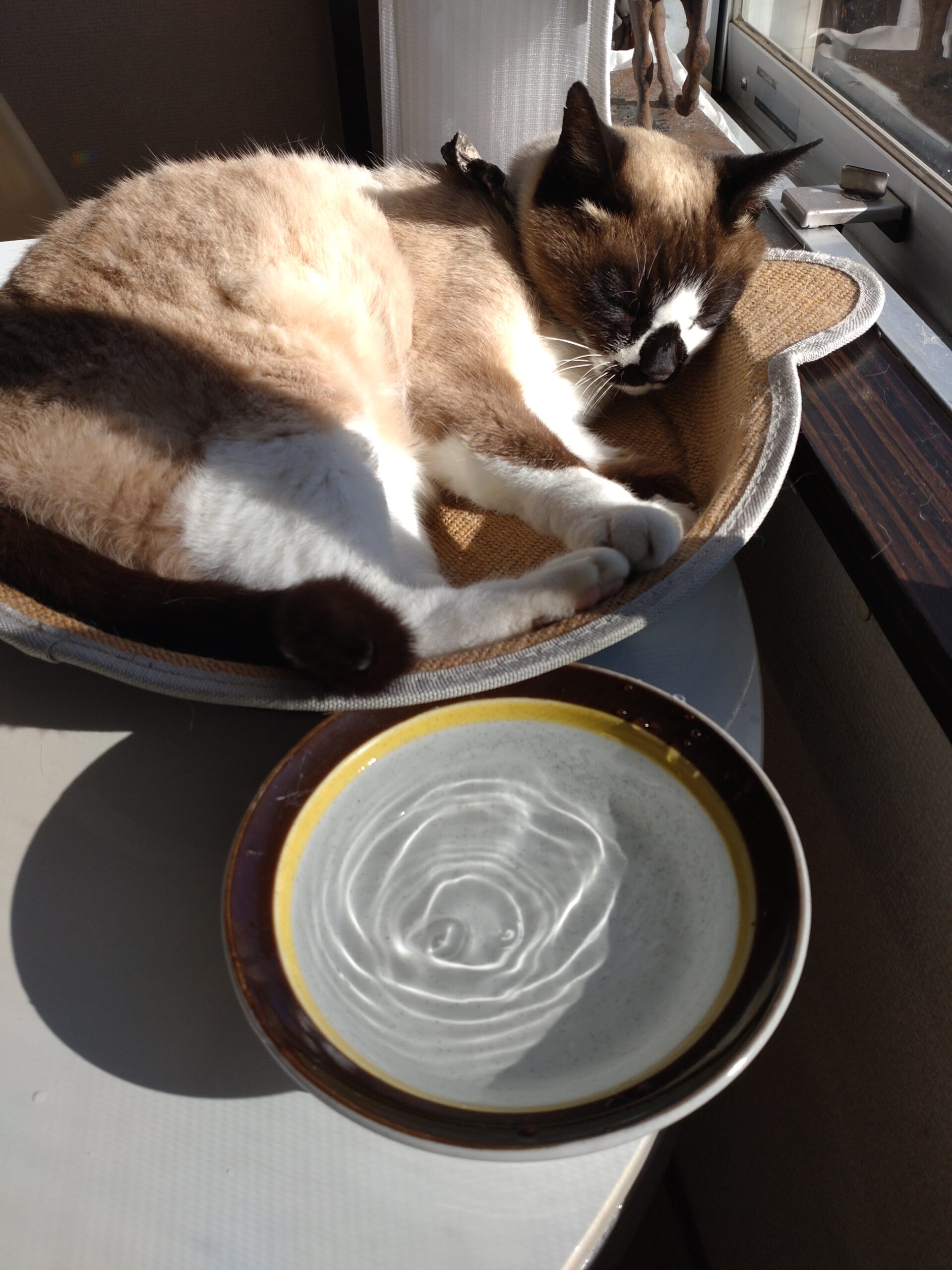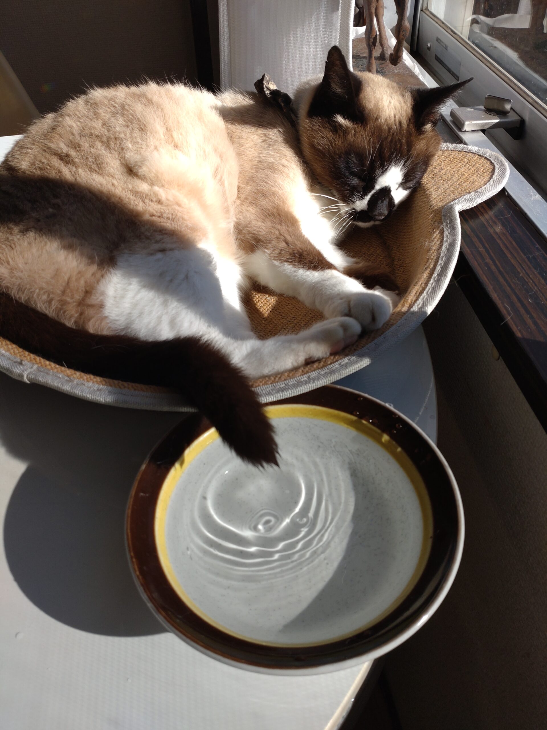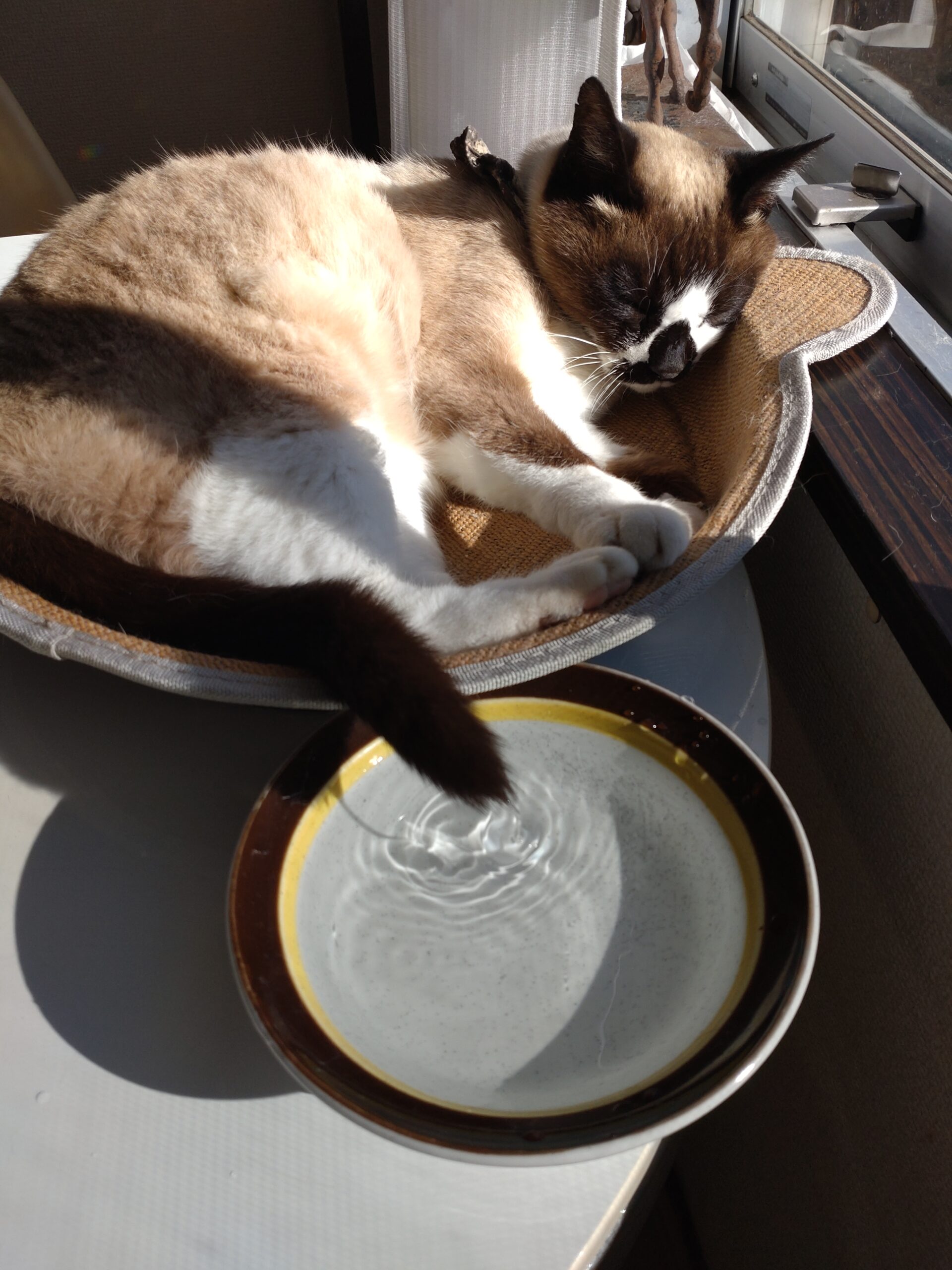 しっぽでぴちゃんぴちゃん波紋遊び 猫な話 2025.01.16 かなり日当たりのいいところで寝ているので、すぐに水が飲めるように、隣に水を置いてあげています。 しかし側を通ると、寝たふりしながらも、わざと水面をぴちゃんぴちゃんぴちゃんぴちゃんと叩き「構っていいよ」とアピールします。 1番お気に入りの水飲み場で、1番沢山水を飲んでくれる場所。 楽しんでくれることは嬉しいです。下僕はそう思いながら主人の命令に従いびちゃびちゃにしたテーブルを毎日拭き続けるのでありました。