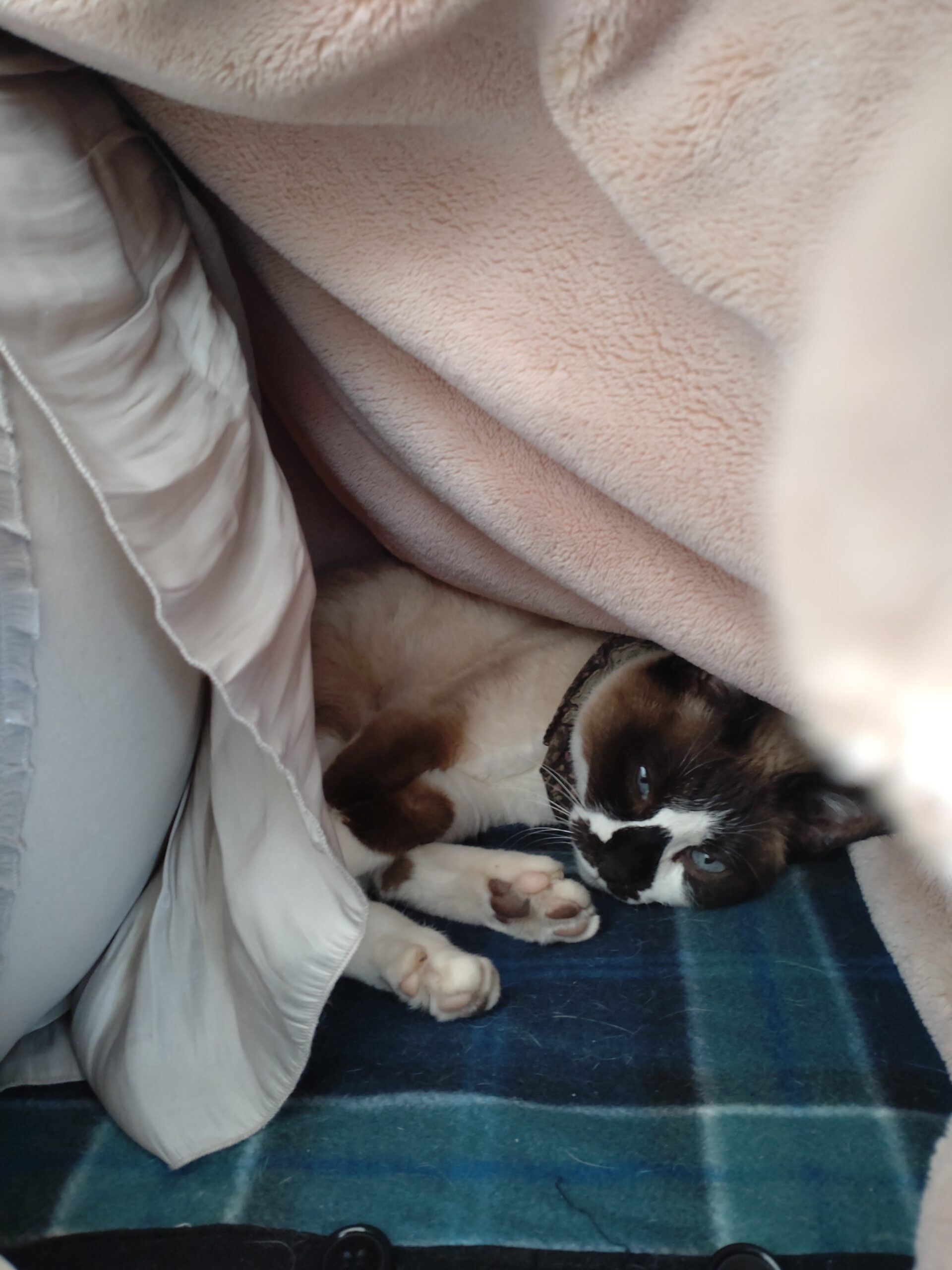 いないと思ったら 猫な話 2025.02.26 こんなにいい天気で、いつも日向ぼっこしている、どちらかにもいないなぁと思って、ソファーの毛布をぺろっとめくってみたら! いましたいました。 はい、おやすみなさい。