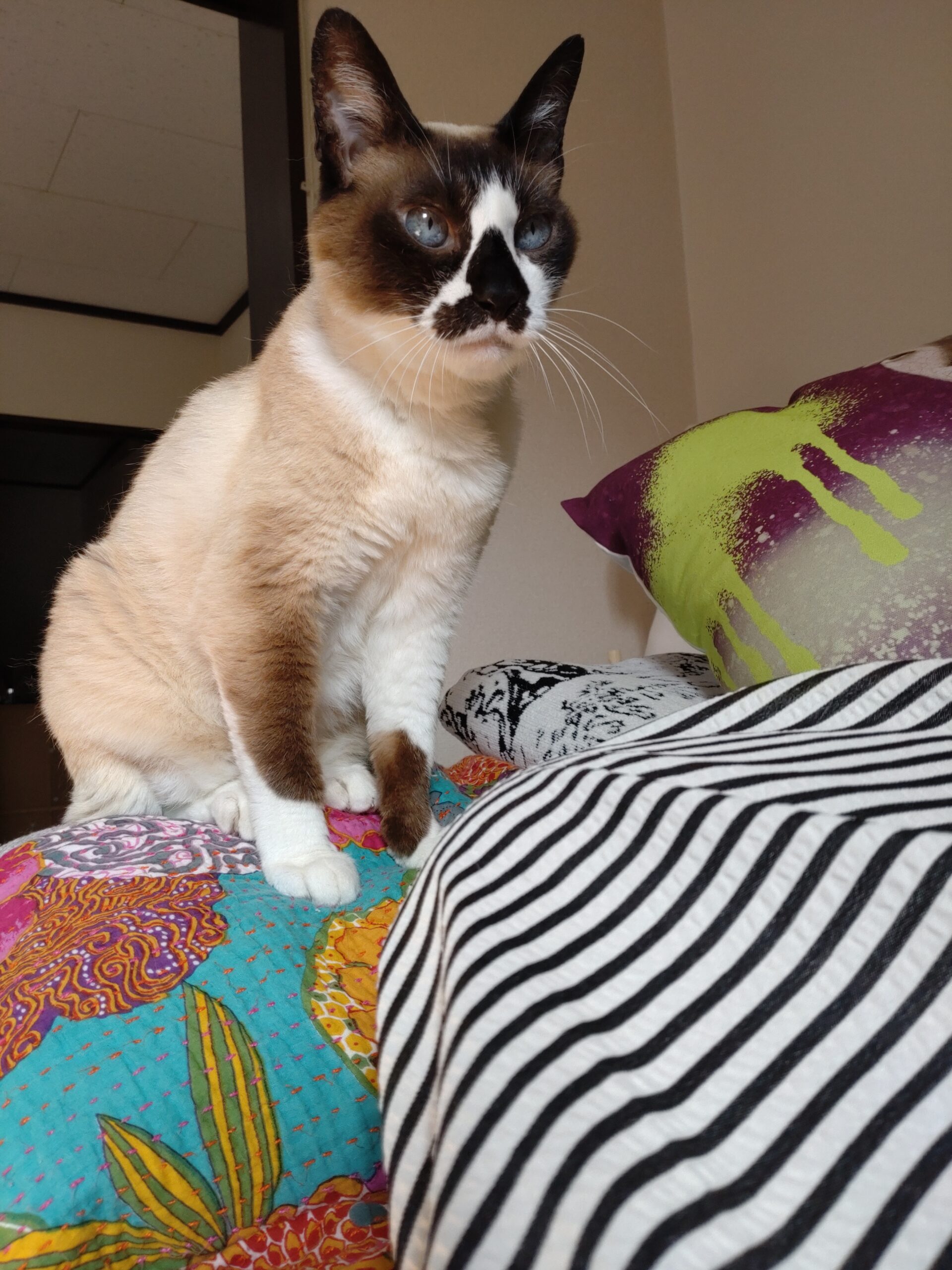 って降ろしたらムスッとした顔で見つめてくる台風の日の猫。