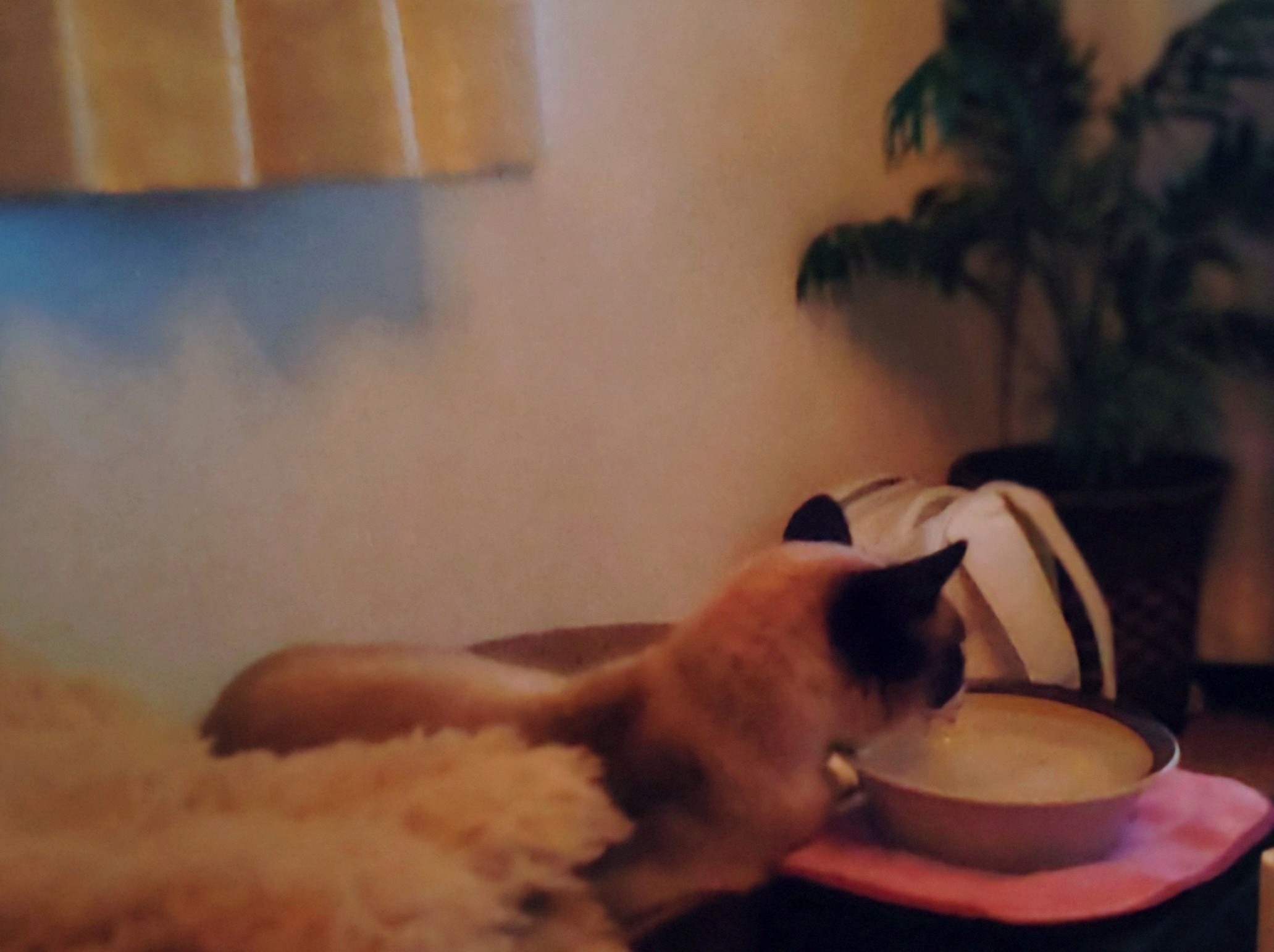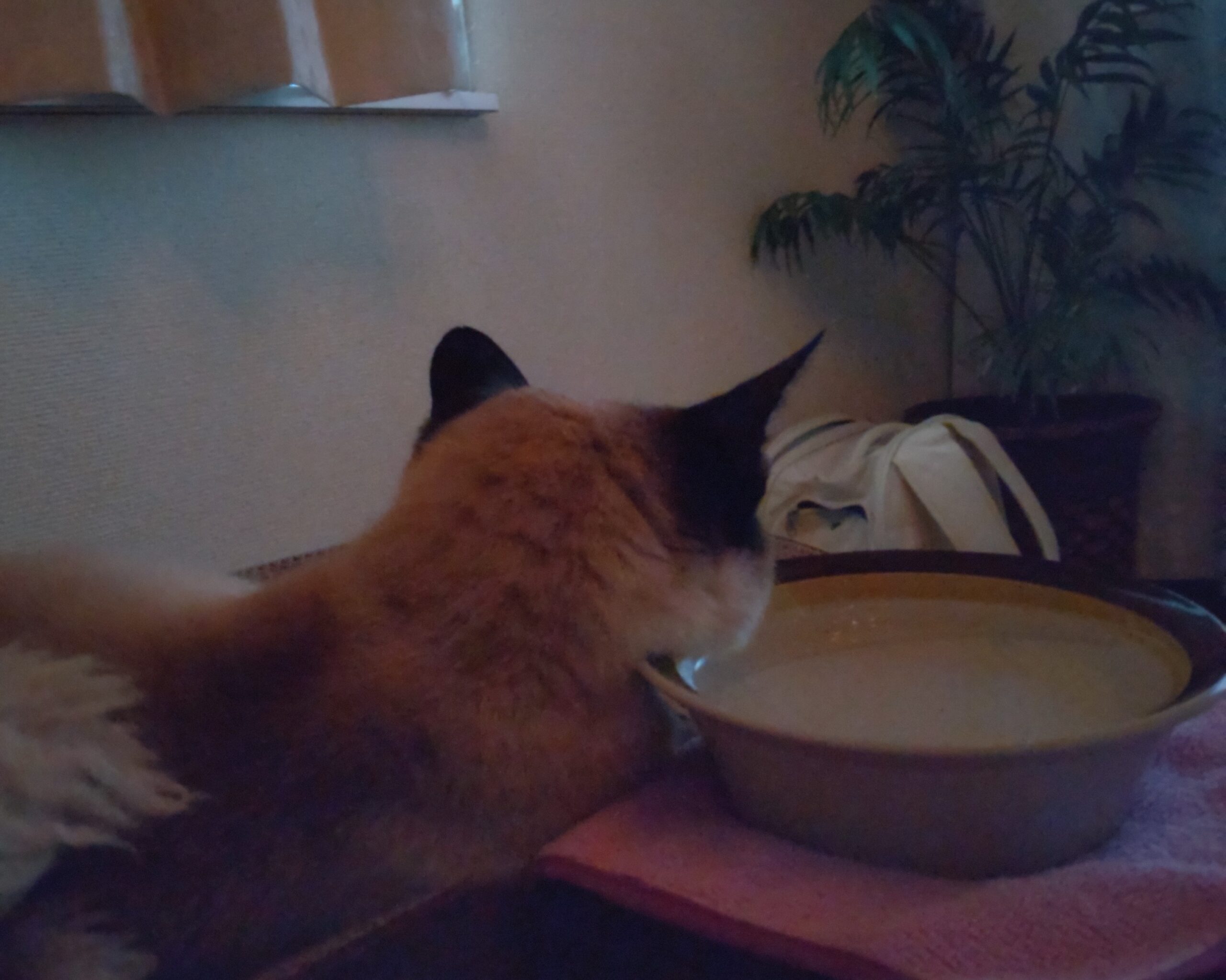 寝たままお水飲んでいると思ったら、そのまま器に顔乗せてまた寝た!