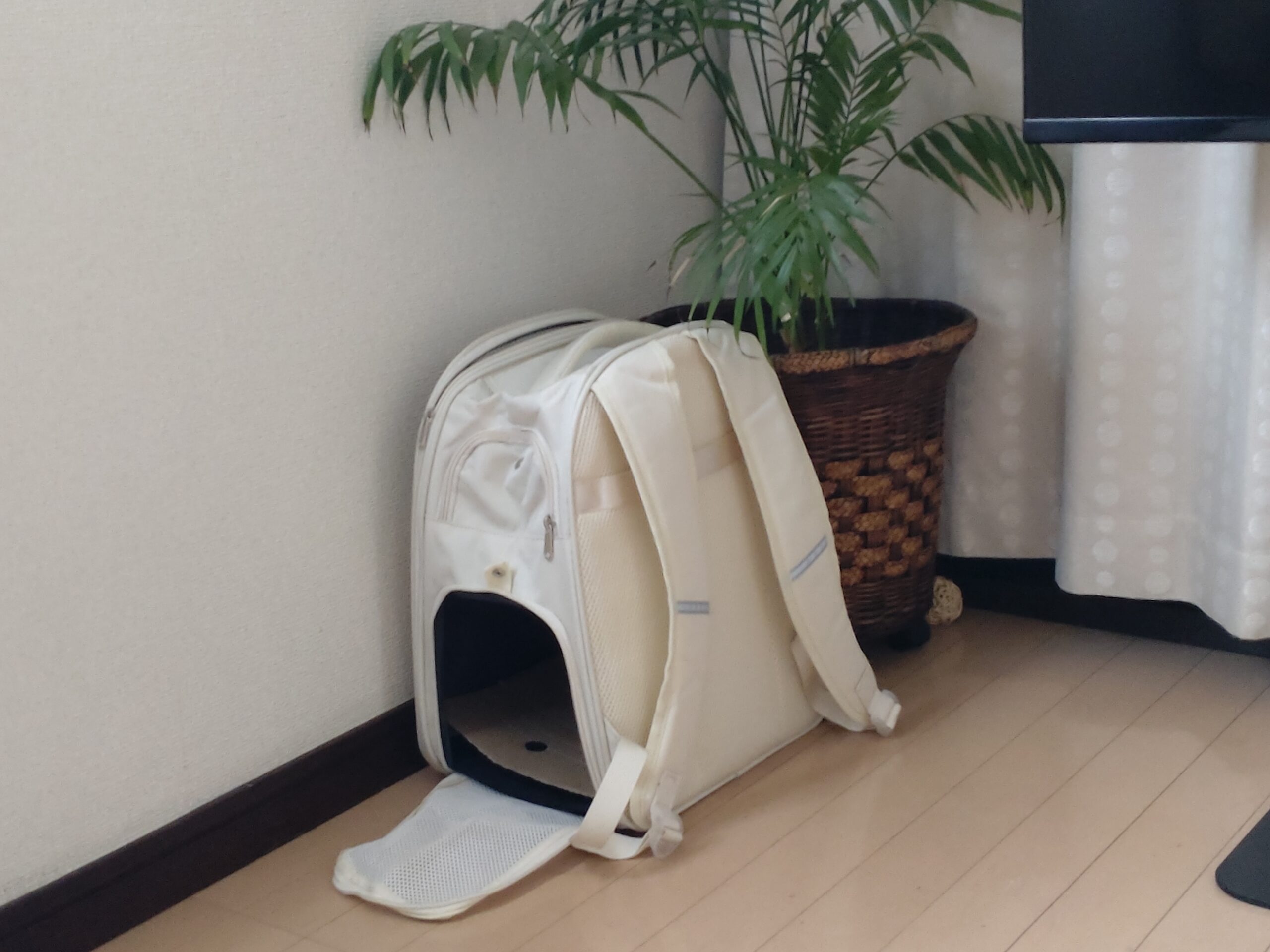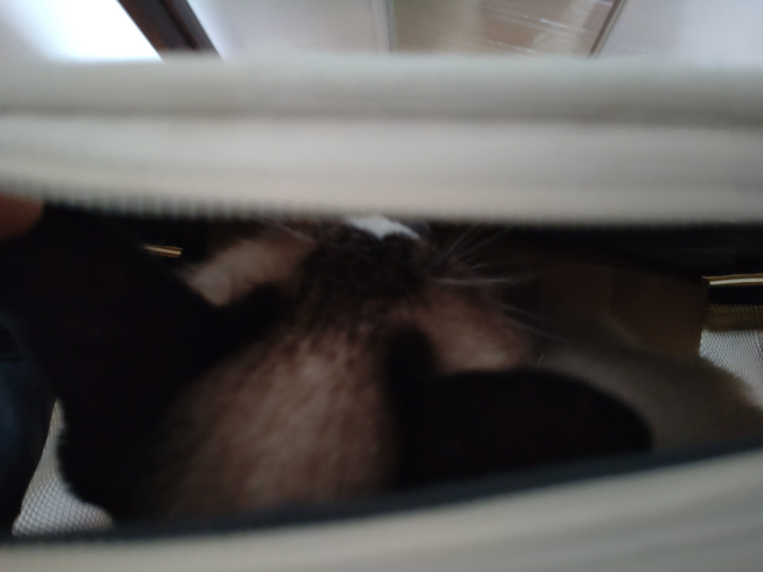 避難用猫リュック 猫な話 2025.08.29 …だったはずが、慣らすつもりで常設したら、大好きな父チュールに直通どこでもドアだと思ってる。 上から覗いた猫がこちら。 「さ、早く父の前まで運んでくださる?」