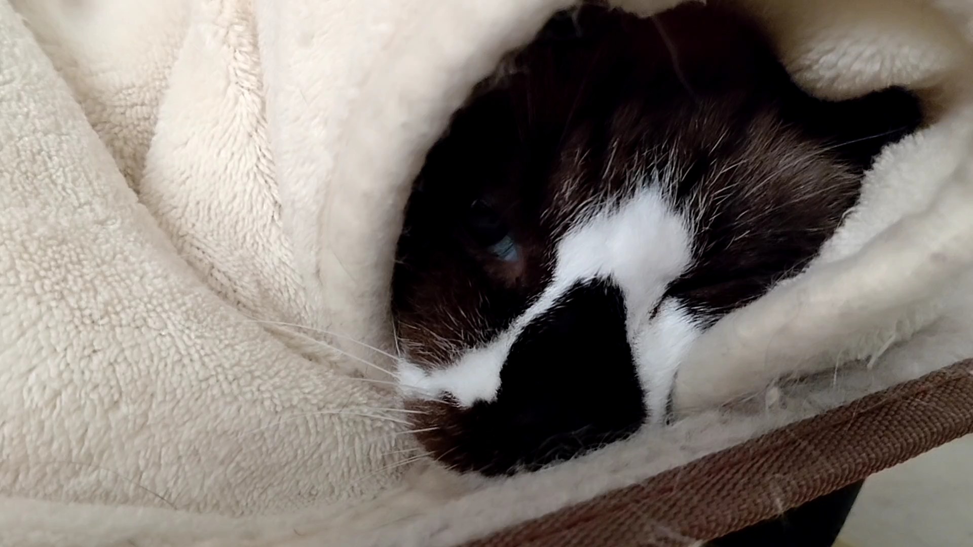 ねこタワマン最上階で、お気に入りのブランケットにくるんでもらい喉ゴロゴロ中。