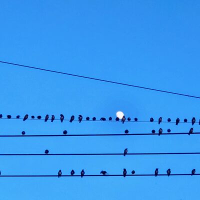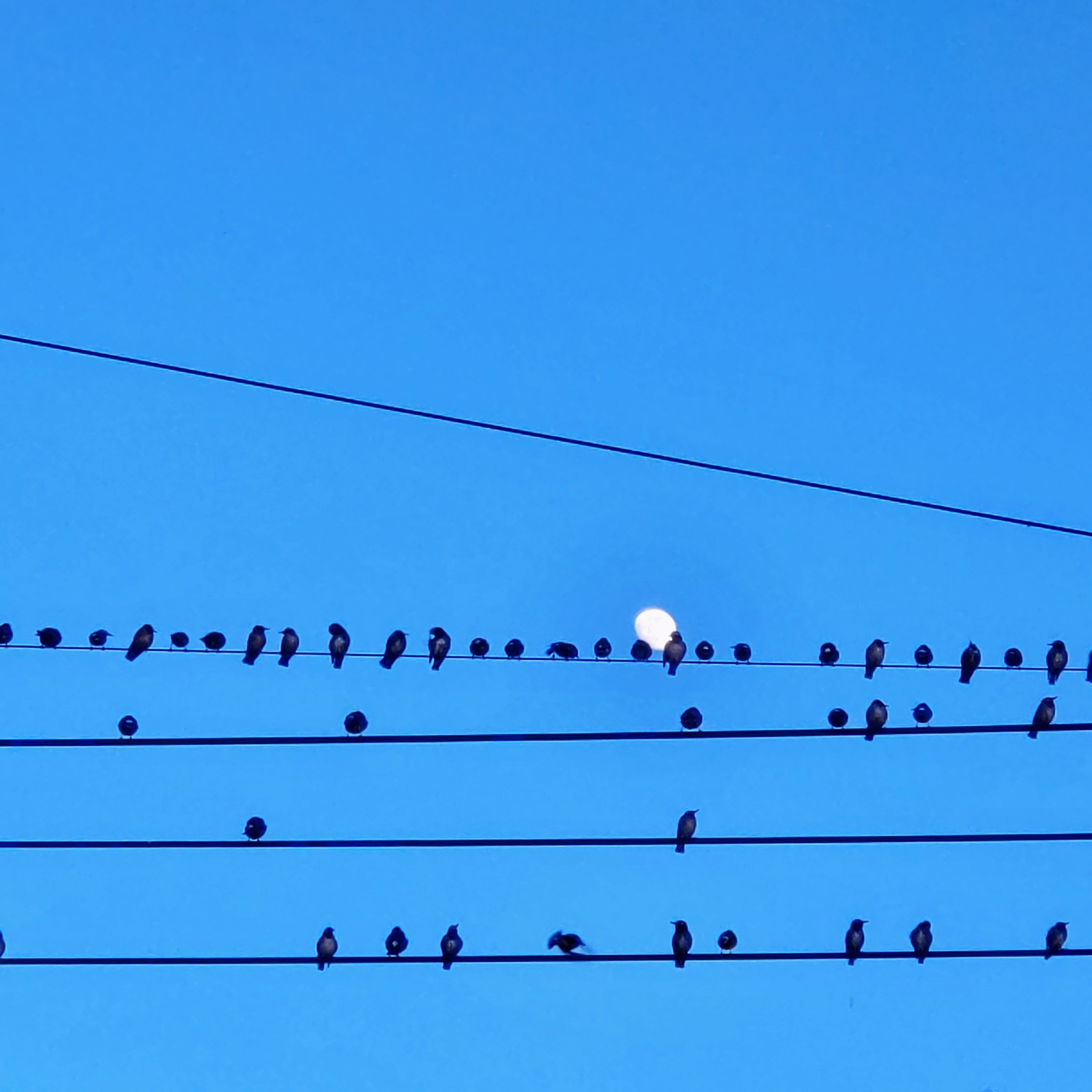 ムクドリの群れ その他 2026.01.02 沈みゆく太陽からの熱を、 最後の最後まで浴び、 背中の月に気がついていないムクドリたち。 そしてそして…なぜ…なぜうちの前だけにいるのだろう? #鳥のいる暮らし #月と鳥 #市街地に住むムクドリ #この後雪予報
